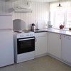 - Küche mit Essplatz. Herd, Kühlschrank, Geschirrspülmaschine, Kaffeemaschine und Geschirr.